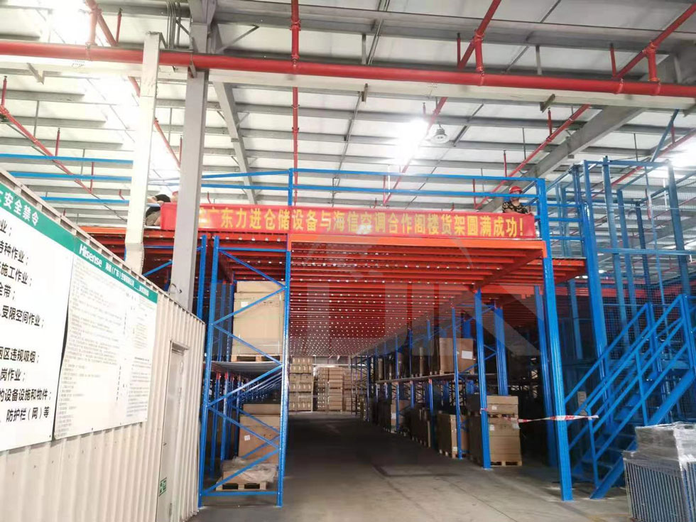 為海信空調倉庫定制閣樓貨架,增加100%的空間利用率,擴大倉儲面積,節省租金成本。力進倉儲16年專注倉儲設計,為客戶提供更完善的倉儲方案!